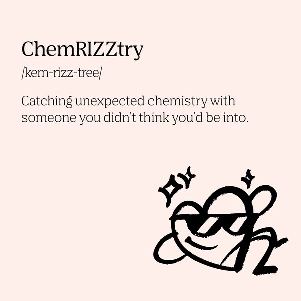 - ChemRIZZtry (kem-rizz-tree): Catching unexpected chemistry with someone you didn't think you'd be into, thanks to their undeniable charisma. One in four singles have felt this surprising shift, proving that attraction isn't always love at first sight…sometimes it's love at first "rizz."